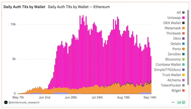 Reown’s tracking of WalletConnect method usage shows that wallet_sendCalls accounts for a tiny fraction of daily transactions. Legacy methods like eth_sendTransaction and personal_sign still dominate.