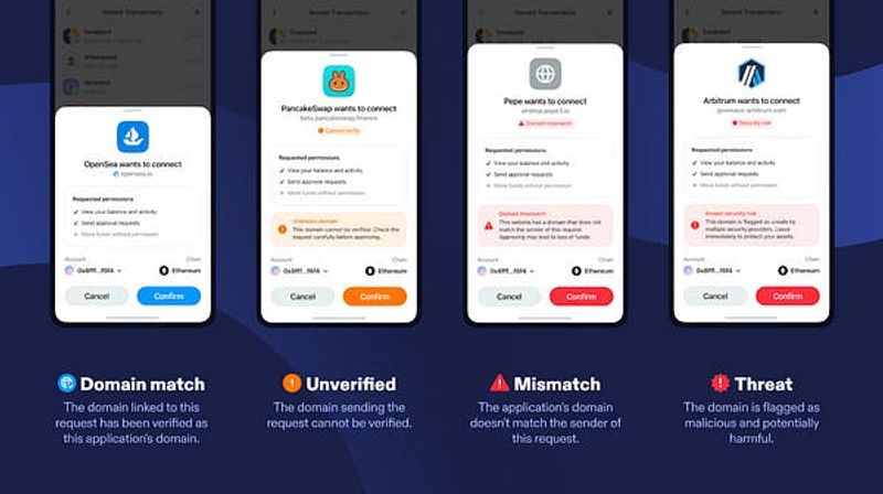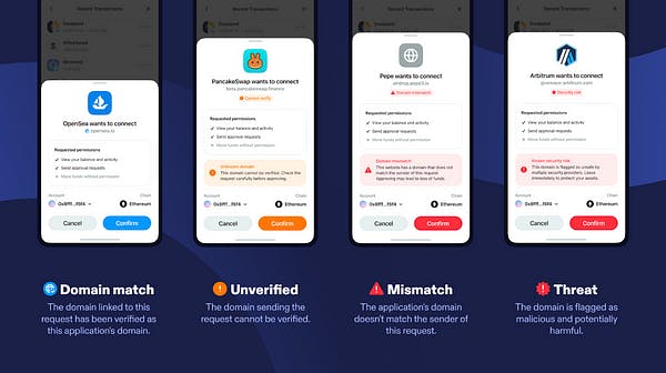 Plus, Verify API’s four-level security system — categorizing session requests as Invalid, Unknown, Valid, and Threat based on their sender’s authenticity — empowers you to customize the cues and messages that you provide to users when they’re connecting to an app or signing a transaction. This gives you the flexibility to shape the UX for your users.