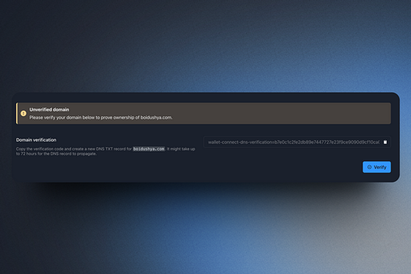 By following the outlined steps, you’re not only verifying your domain but also enabling a seamless integration of your website with the powerful features that the Verify API brings to the table. It enables wallets to help their users determine whether the domain they’re about to connect to might be malicious, ultimately enhancing user experiences and providing an additional step for them to better distinguish your app from a potentially harmful one.