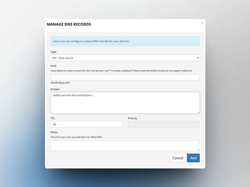 Edit DNS Records: In the DNS settings, select “TXT” as the record type. Paste the copied verification text into the “Answer” section. Note that the field names might vary based on your DNS provider. If you’re verifying a subdomain, add it under “Host.” Leave the TTL value at its default setting.