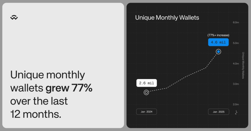 Unique monthly Wallets grew 77% over the last 12 months from 2.6 million in January 2024 to over 4.6 million wallets in January 2025, showing a huge growth of web3 users in the last 12 months.